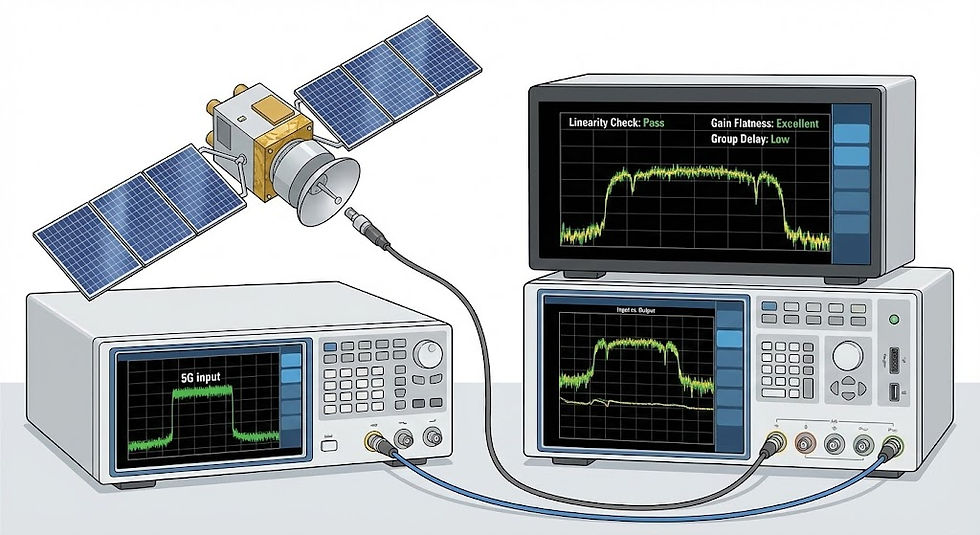 Vector Signal Generator (VSG) and Signal Analyzer (VSA). The focus here is on the linearity, gain flatness, and group delay of the transponder. Since the satellite acts as a mirror, it must reflect the signal back to Earth without distortion.